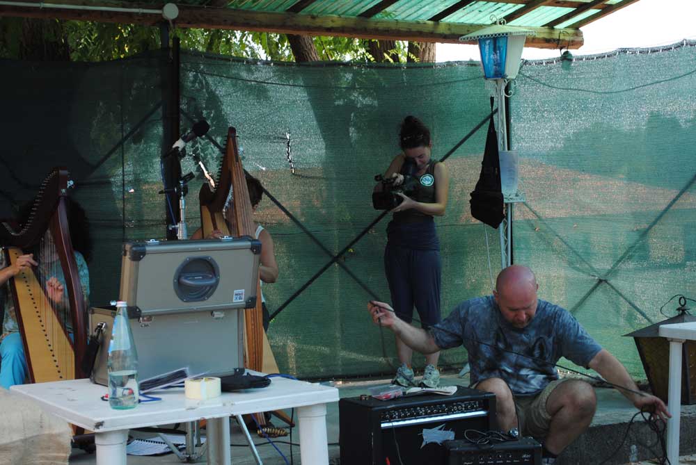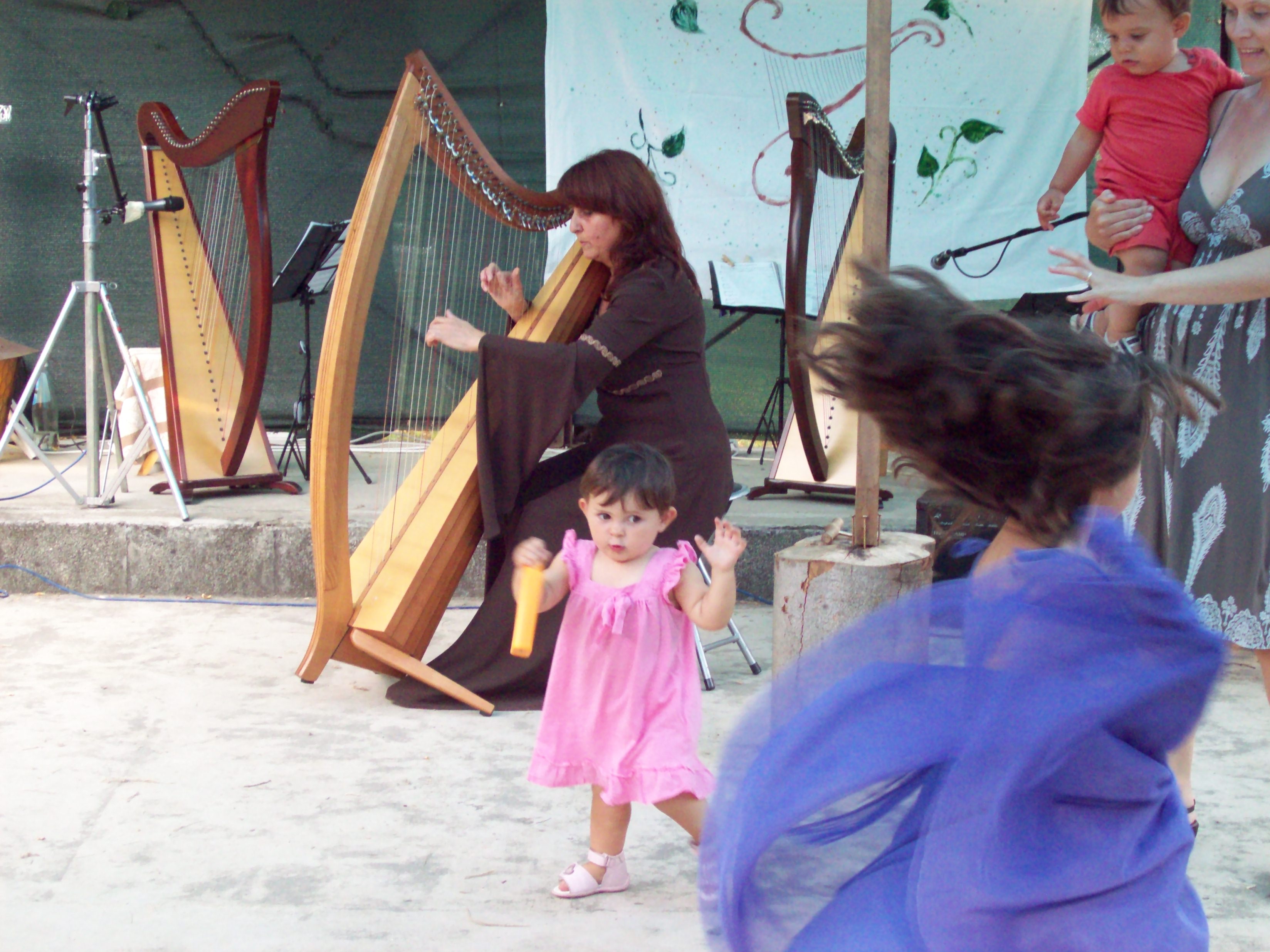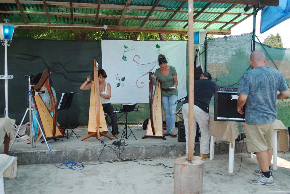 Noi abbiamo suonato a partire dalle 19.00 circa, accompagnando la cena con musiche celtiche suonate e cantate e con brani medievali; nella seconda parte della serata – come da programma- abbiamo portato le arpe in un bellissimo anfratto naturale posto un po’ in alto rispetto agli altri luoghi della festa in cui si svolgevano le varie attività. Un semicerchio di pietre e radici di alberi creava una nicchia mentre sopra di noi i rami alti e ricurvi raccoglievano il suono e sembravano amplificarlo.