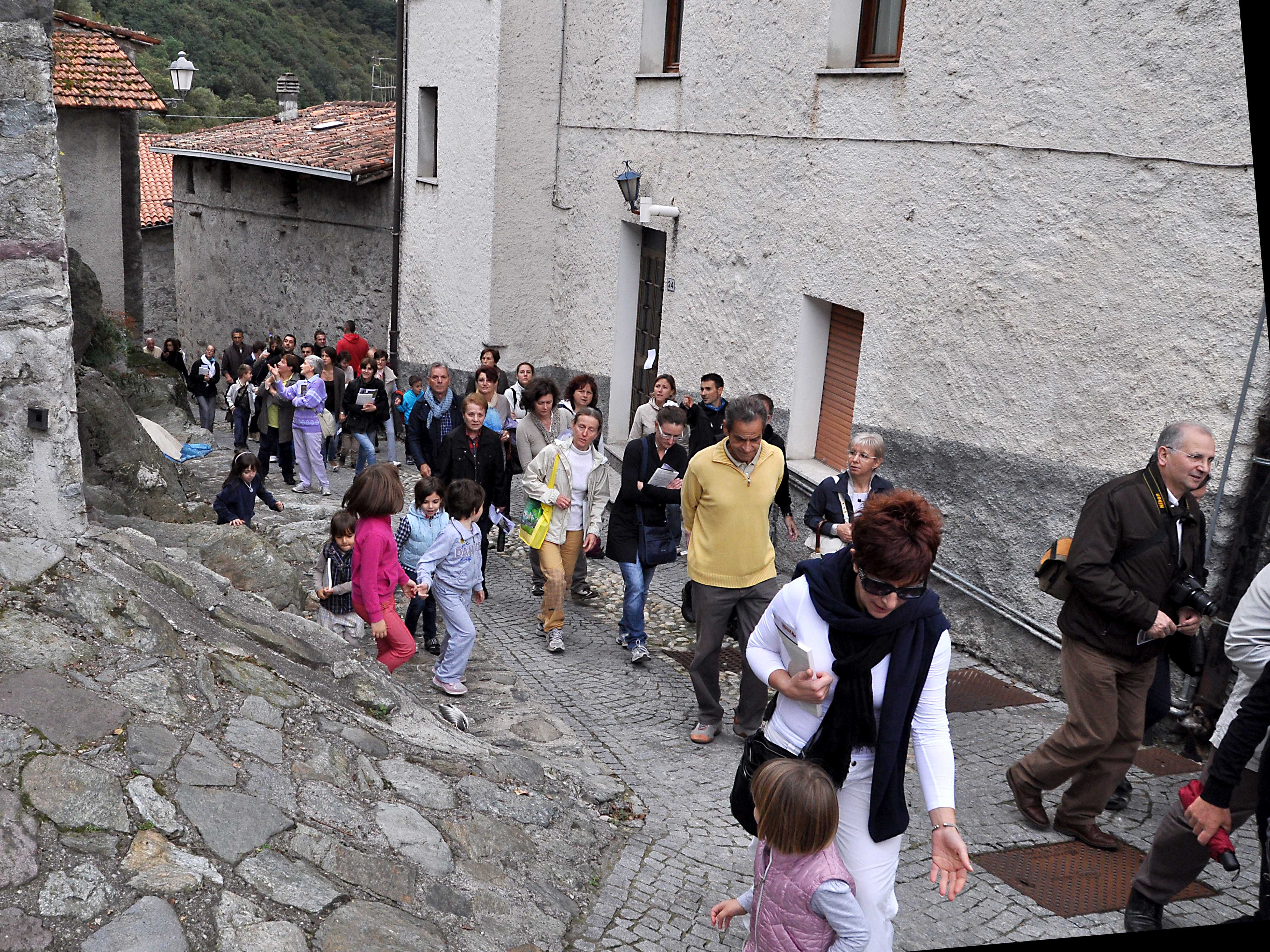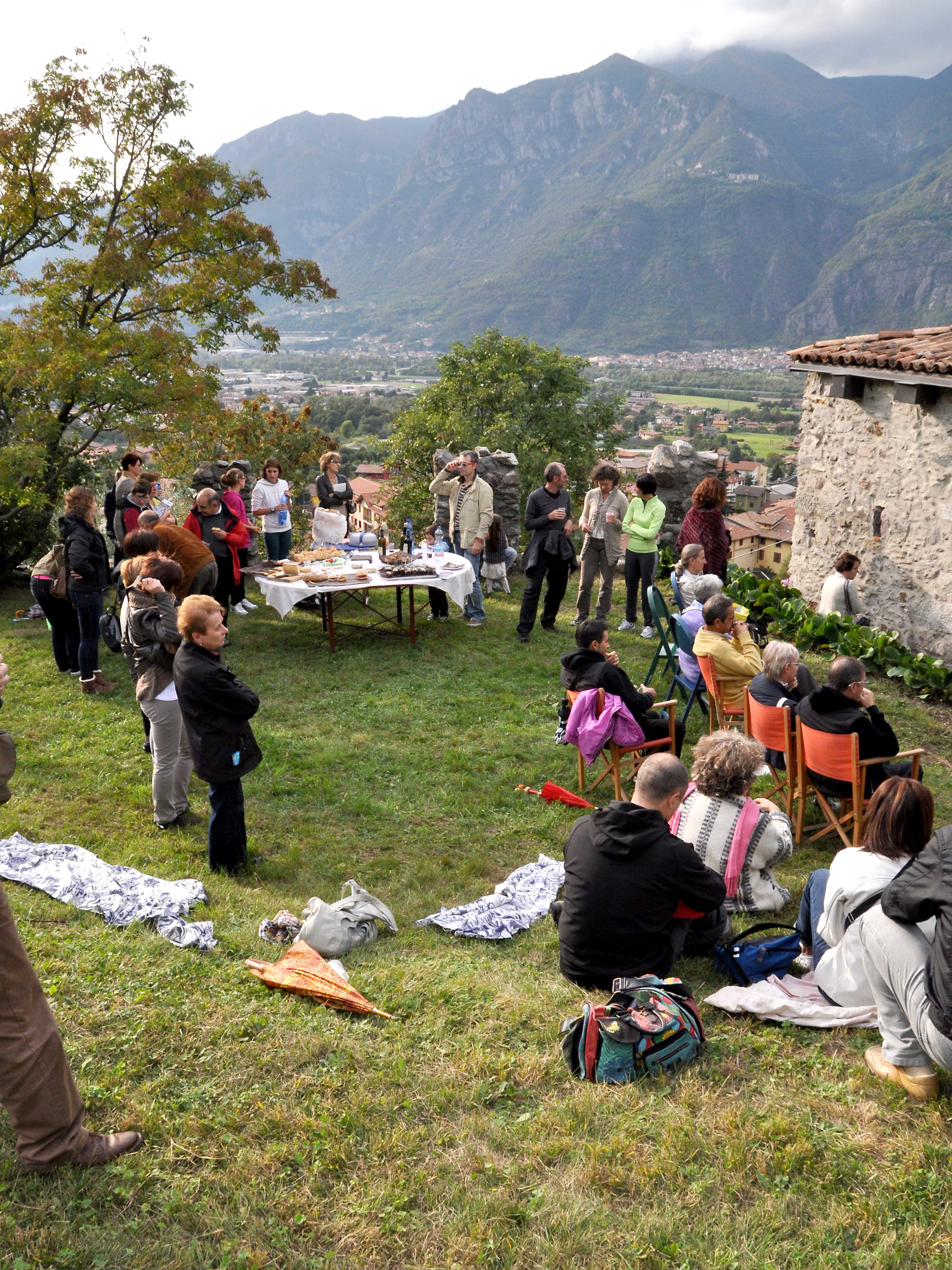 Da una parte del paese i camminanti partono alla scoperta dei luoghi del tempo: seguono le antiche vie, affiancano l’antico canale e salgono per raggiungere ‘il Castellino’ …