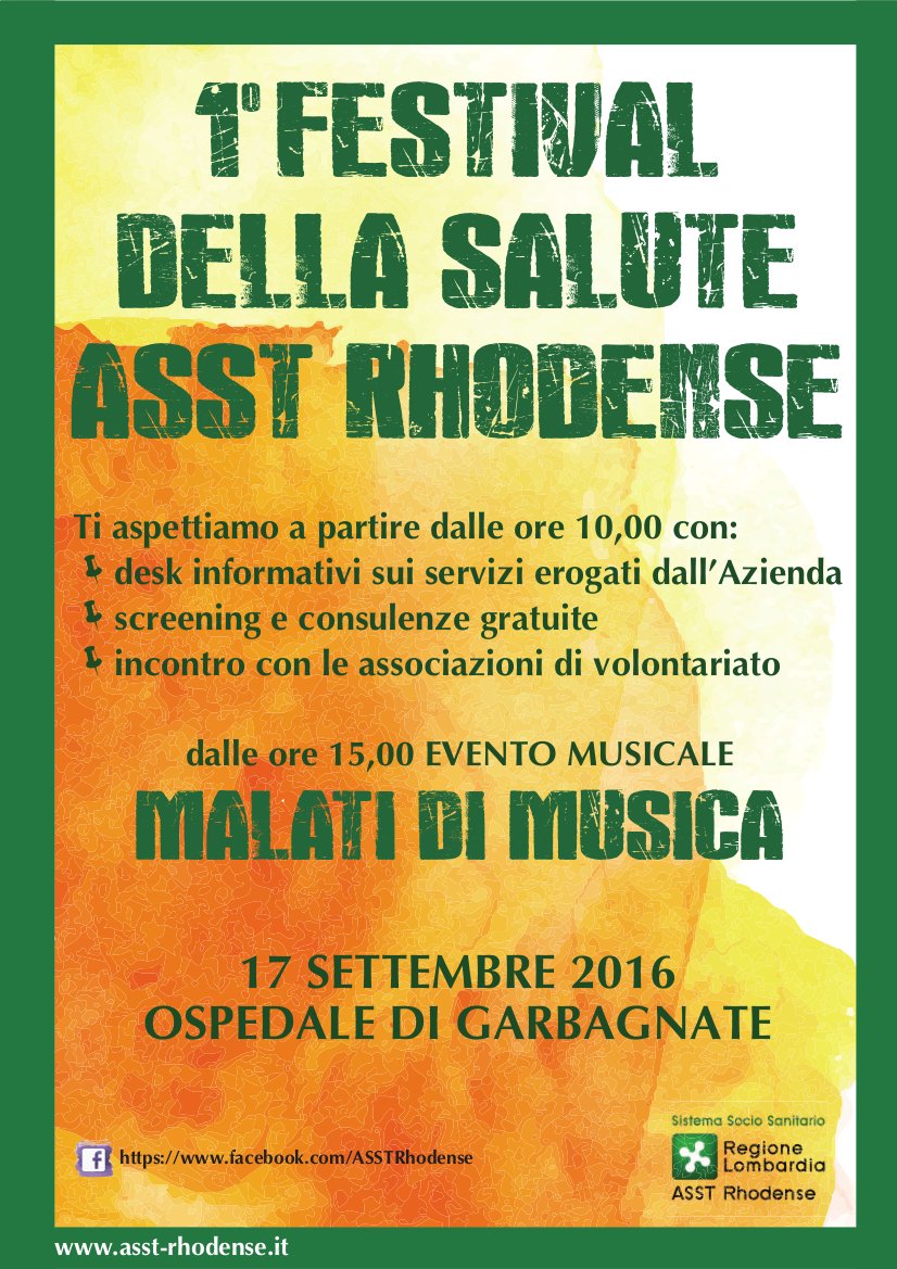 In occasione del Primo Festival della salute organizzato dal nuovo ospedale di Garbagnate Milanese saranno presenti diverse associazioni di volontariato e dalle ore 15:00 verranno proposti piacevoli momenti musicali.