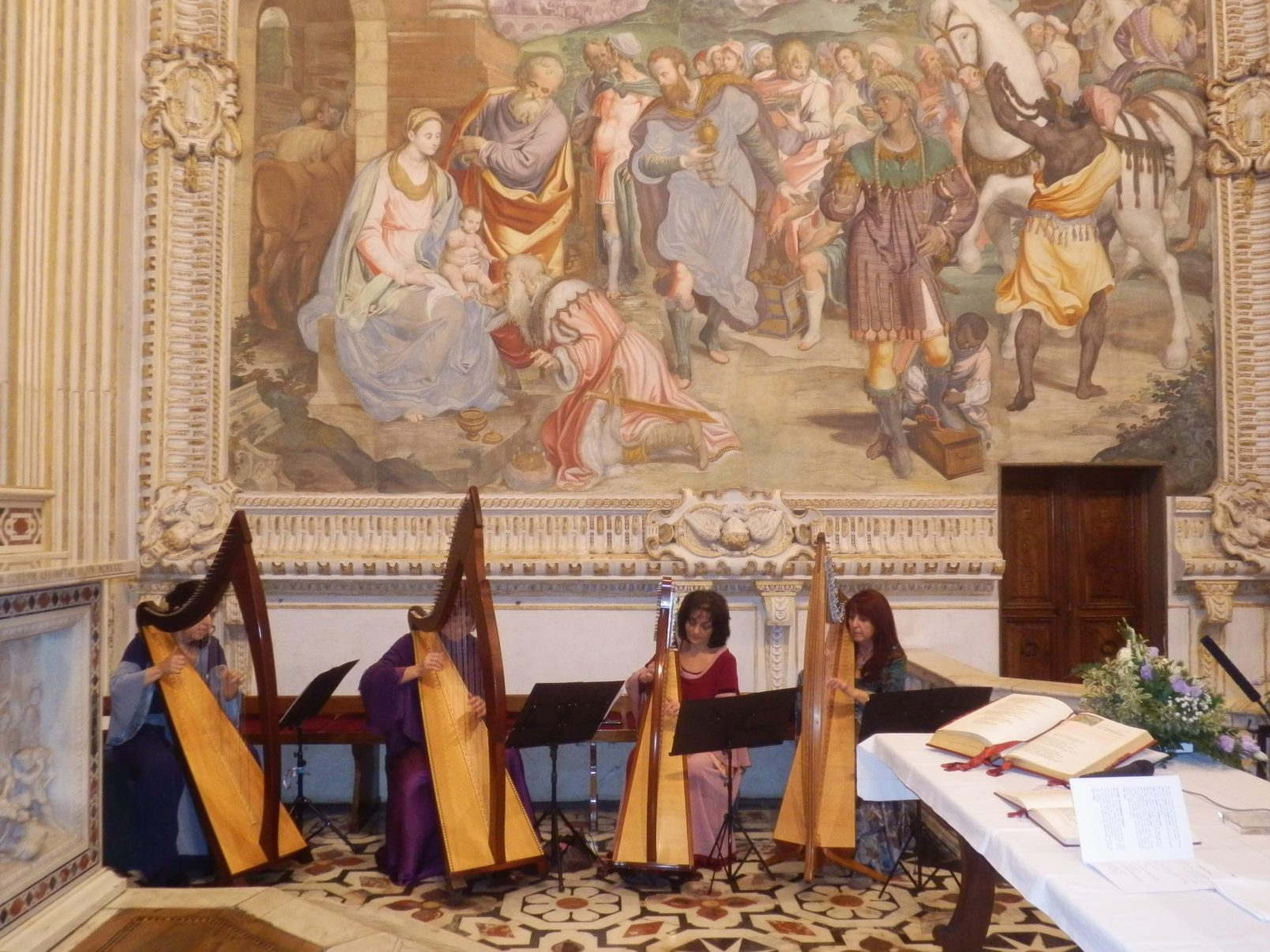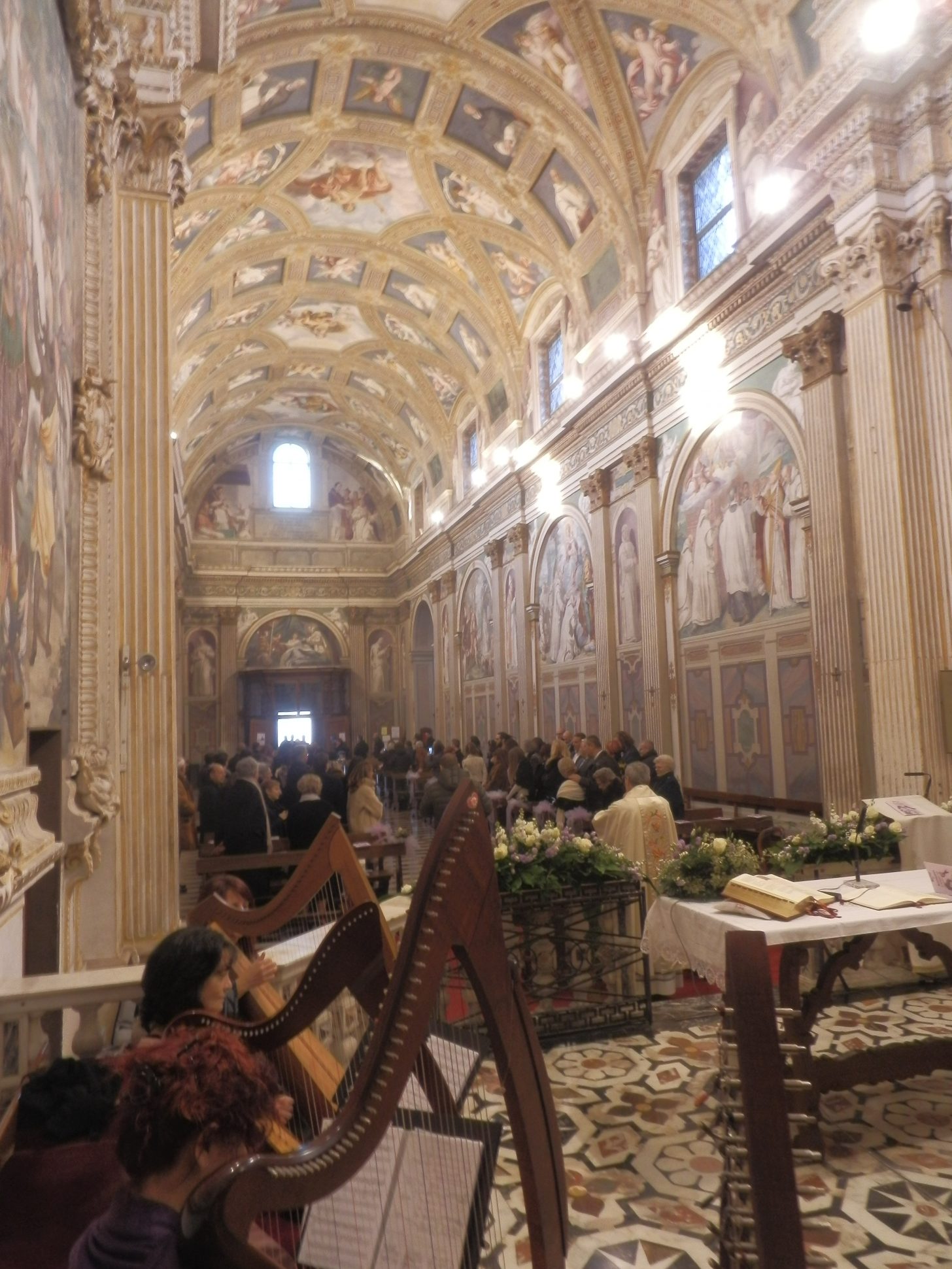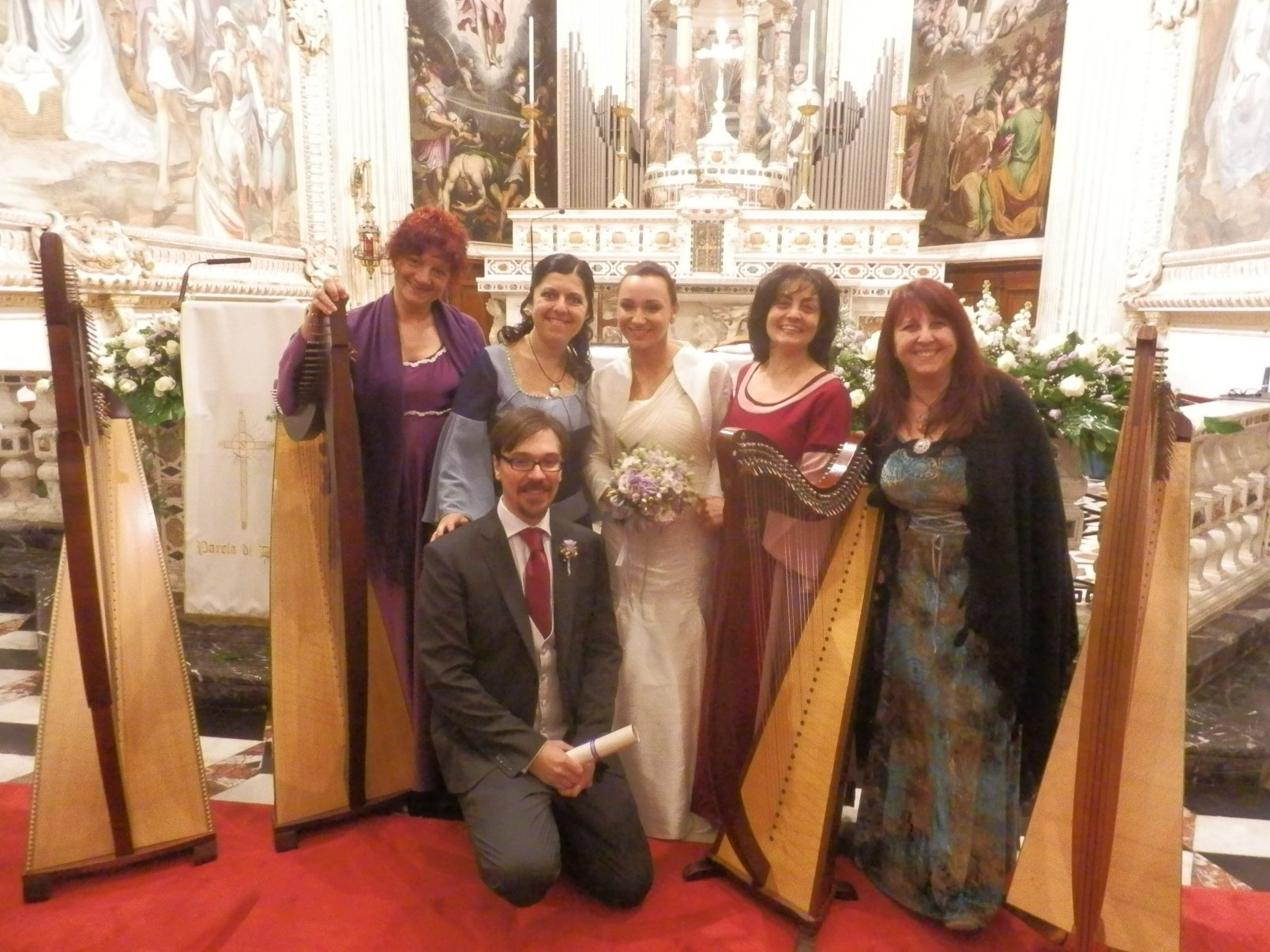 L’emozione dei parenti e degli amici è palpabile, e le note provenienti dalle corde delle arpe non la coprono, come avverrebbe con la solennità di un organo, bensì la accompagnano e vi scivolano attorno, come gocce di musica provenienti dall’abside.