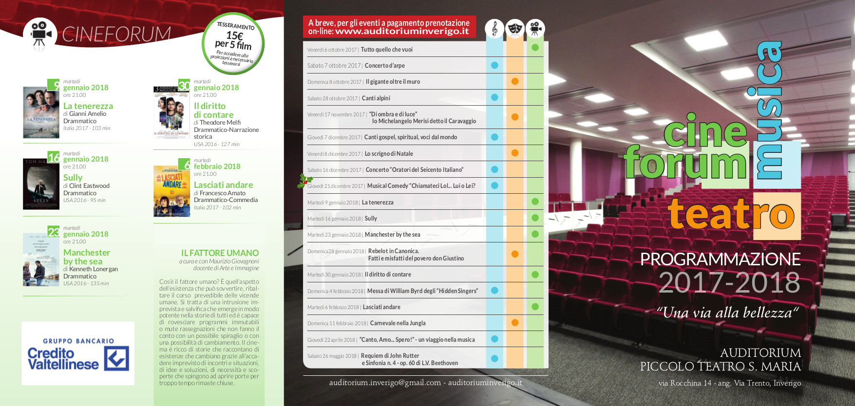 Si apre la stagione 2017/2018 dell’auditorium di Inverigo (Piccolo Teatro Santa Maria) con un fine settimana di eventi – un film, un concerto, uno spettacolo teatrale – che presentano e rappresentano l’intero cartellone dell’auditorium: cinema, musica e teatro!