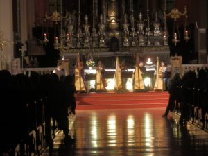 Maestosa e resa ancor più suggestiva dal gioco di luci, la chiesa si è riempita velocemente e il nostro racconto di Quella Notte, come un viaggio musicale alla riscoperta delle radici comuni di un Natale universale, si è arricchito delle immagini familiari del Natale tradizionale.