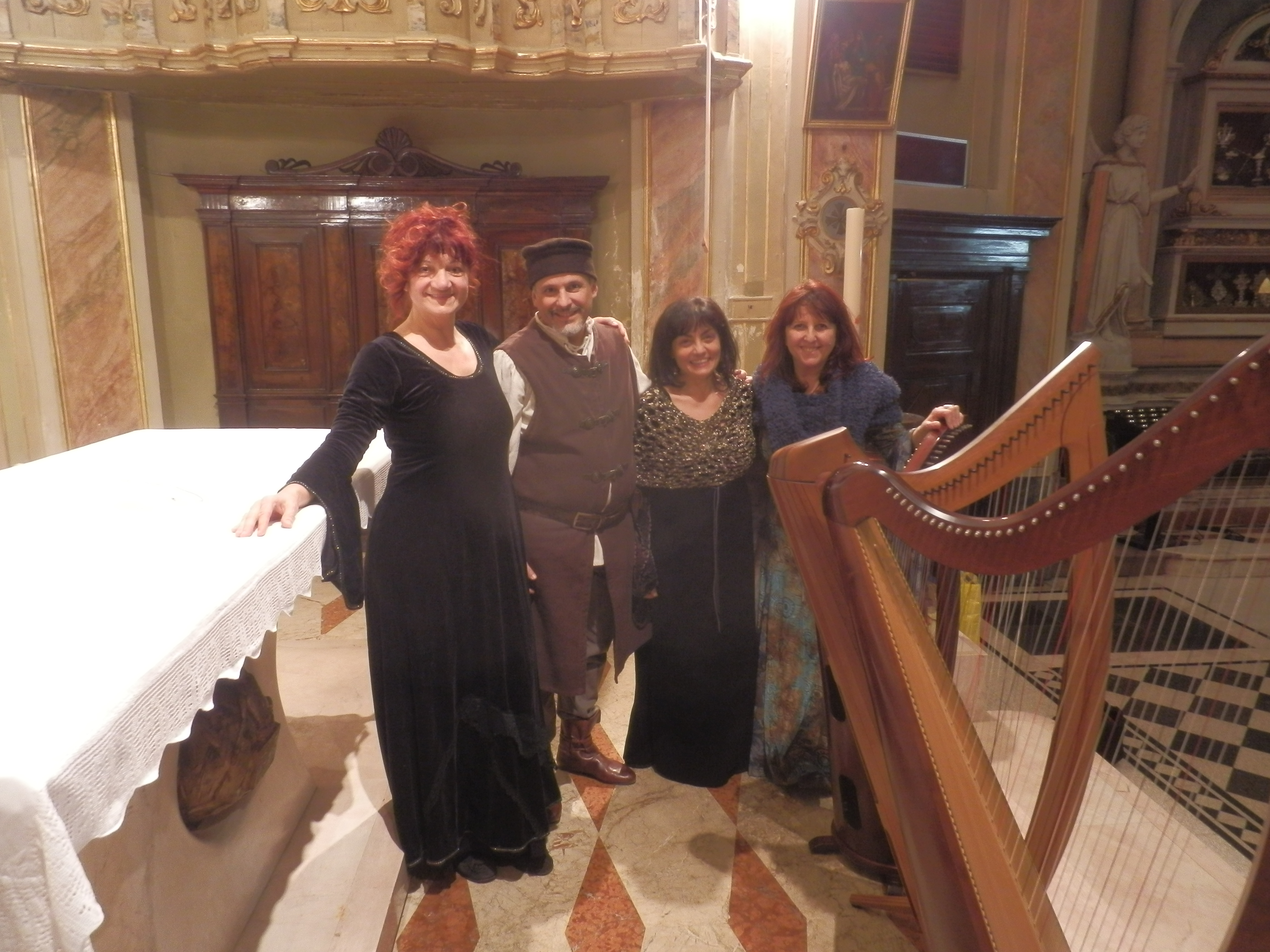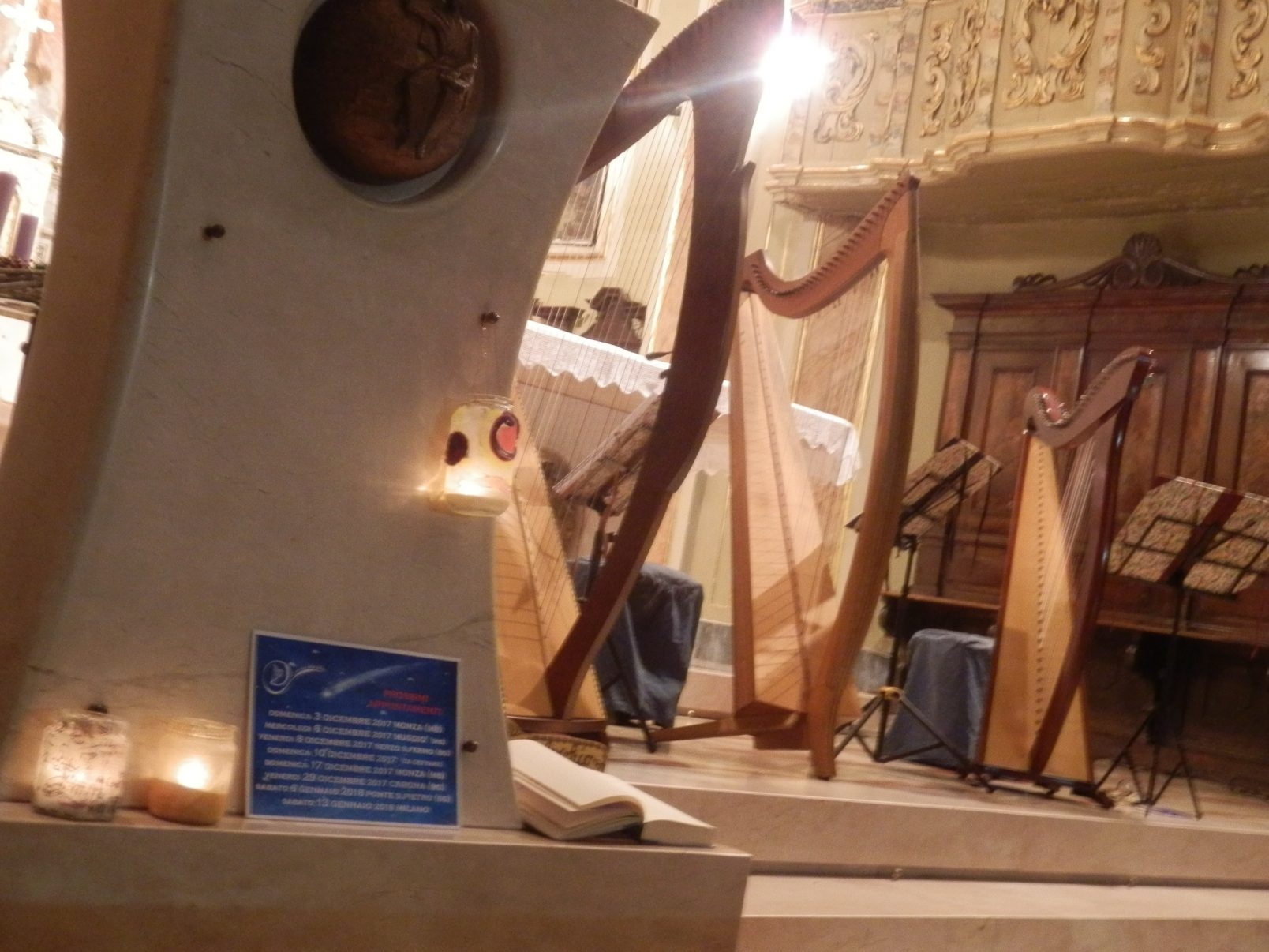 Abbiamo disposto velocemente le nostre arpe, le lanterne, i programmi di sala, i nostri CD, il quaderno delle dediche, leggii, sgabelli, il cartoncino azzurro con le date dei prossimi appuntamenti ….