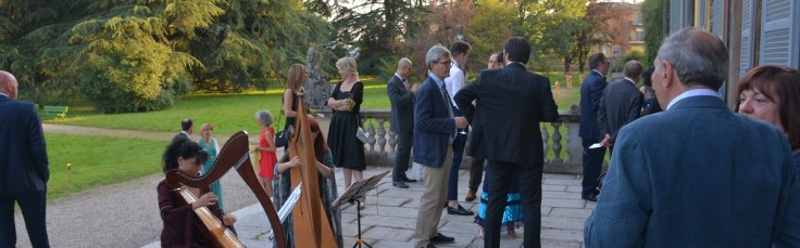 Le nostre arpe sulla terrazza, delicato sottofondo di una elegante e piacevole cena che si è alternata a brevi passeggiate nel parco, per visitare la limonaia, e momenti di condivisione dei progetti sostenuti dalle persone presenti alla serata.