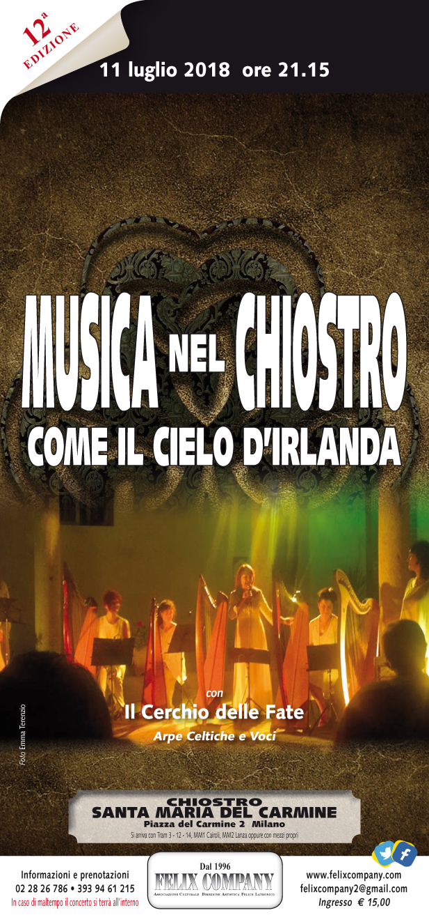 Nel cuore della vecchia Milano, a due passi dall’accademia di Brera e dal Castello Sforzesco, tra le antiche pietre del chiostro di una chiesa ricca di storia e di arte, ascolterete un repertorio celtico tradizionale, ma rinnovato negli arrangiamenti di Patrizia Borromeo: fresco, frizzante, bizzarro e imprevedibile … come il cielo d’Irlanda.