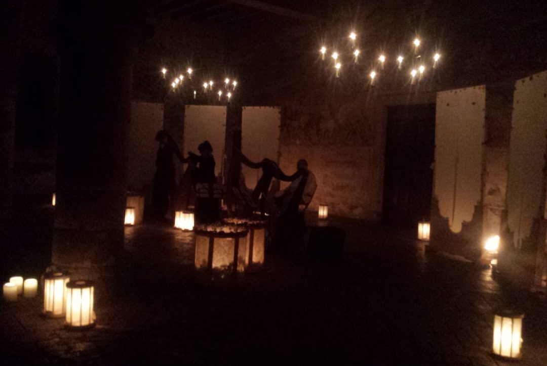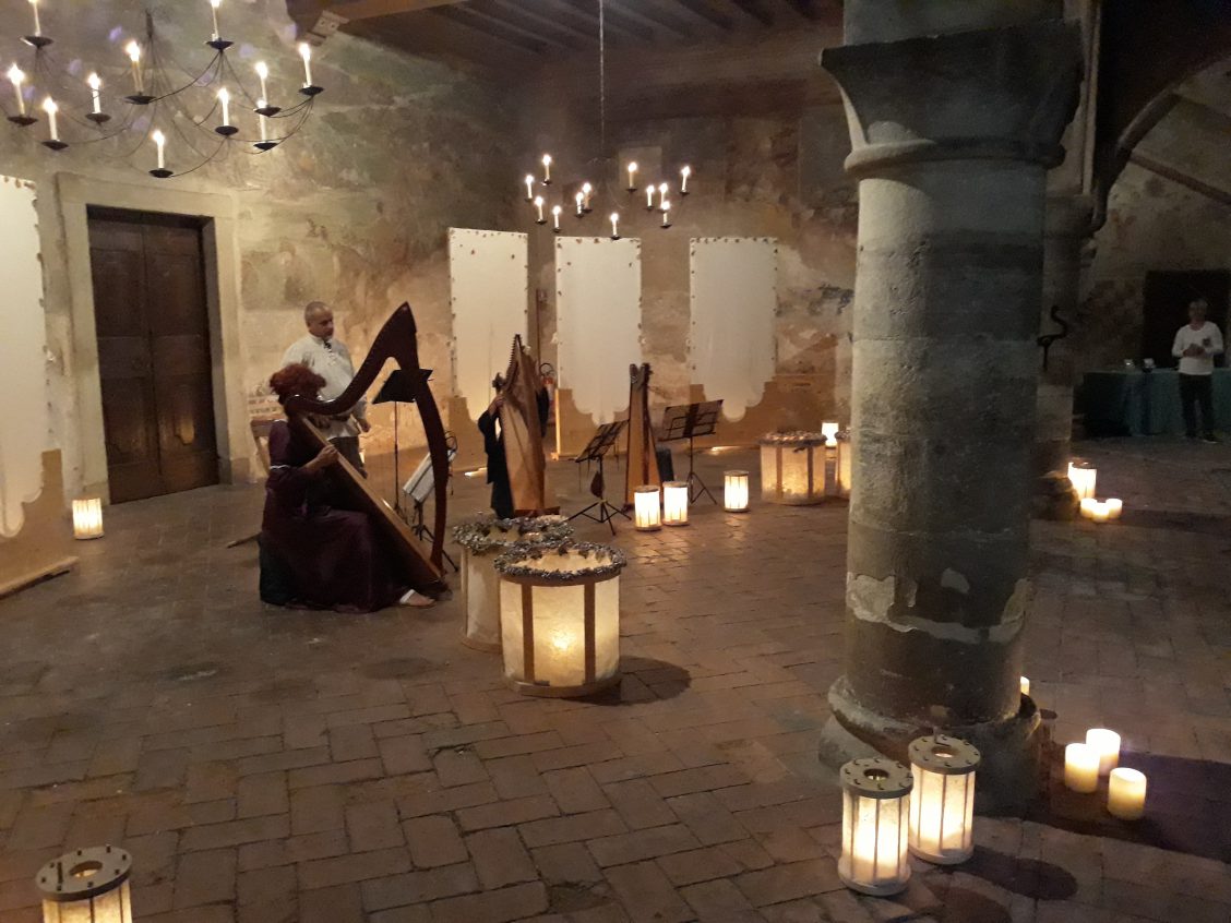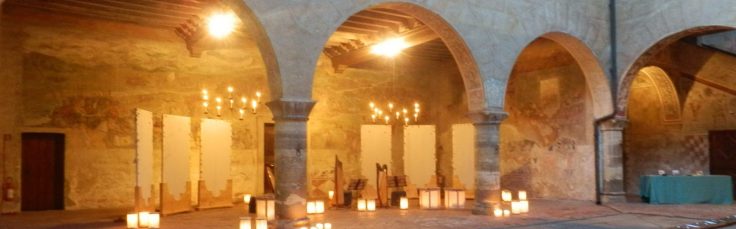 E quando il crepuscolo ha ceduto al buio della notte, un ultimo brano con la sola luce delle candele, tra le pietre del chiostro e il legno delle panche… come nel Medioevo.