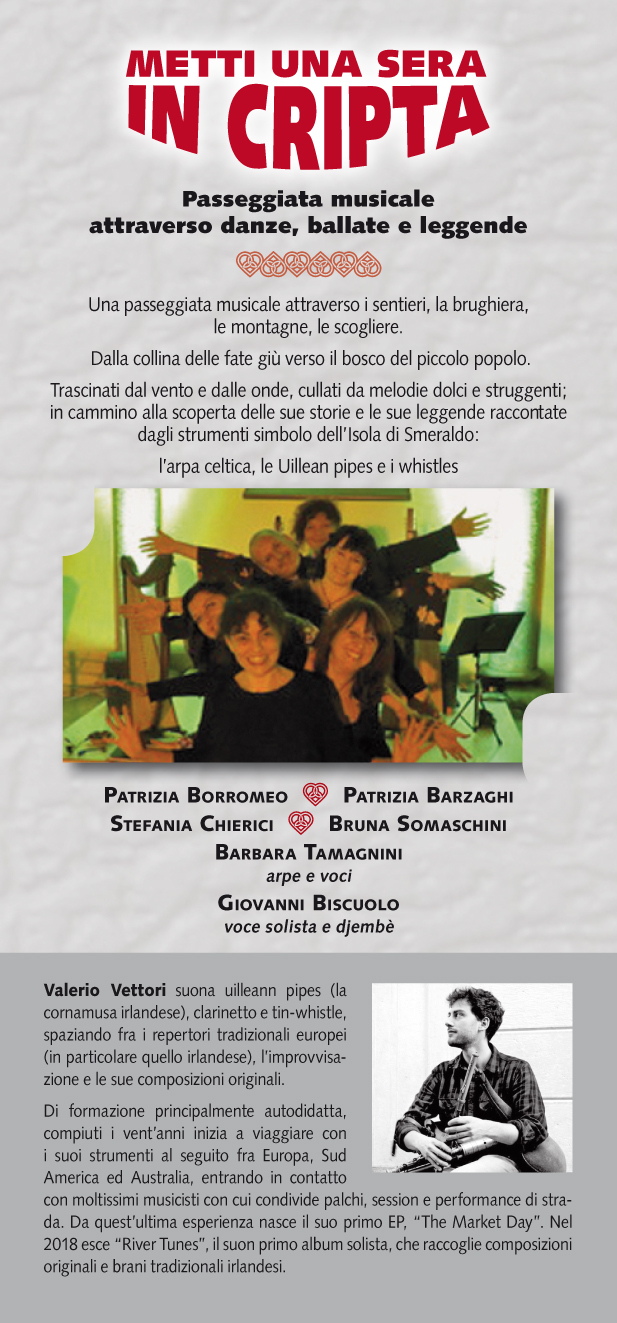 Passeggiata musicale attraverso danze, ballate e leggende con arpe celtiche, voci e cornamusa irlandese (Uillean Pipes)