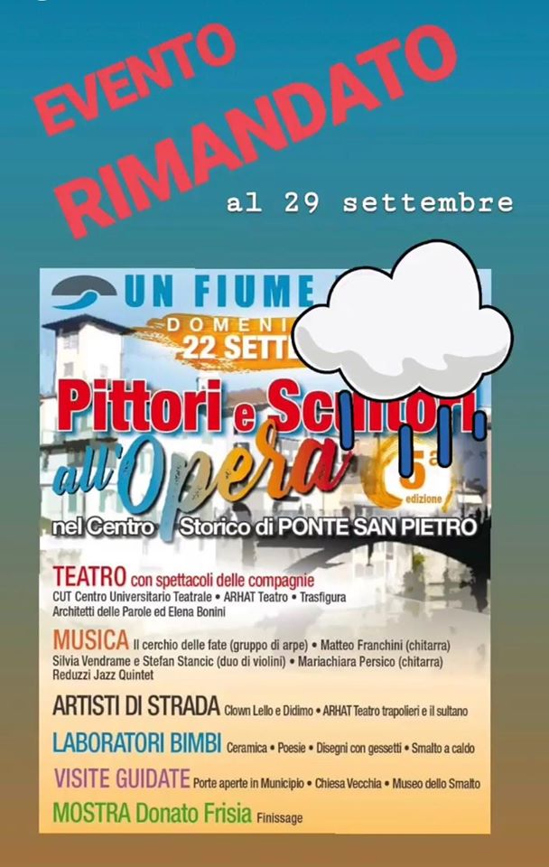 A causa del maltempo l’intera Manifestazione “Un fiume d’arte” è rinviata a domenica prossima 29 settembre.