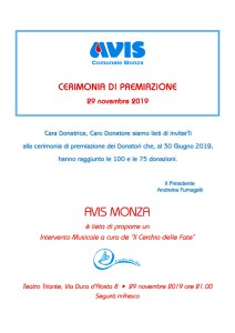 La cerimonia ha avuto luogo presso il teatro Triante di Monza, e ha visto la partecipazione dei donatori e delle loro famiglie; presenti anche Andreina Fumagalli (presidente di Avis Provinciale Monza e Brianza) e Roberta Radice (segretario Avis) che ha presentato la serata.