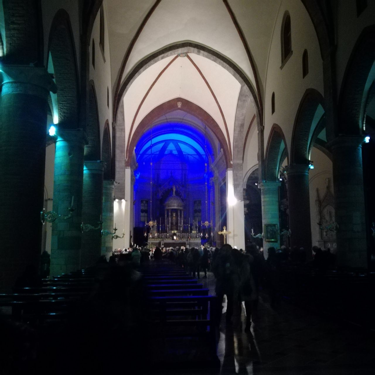 Sulla volta dell’abside un gioco di luci blu e bianche: il cielo stellato di “quella notte”…