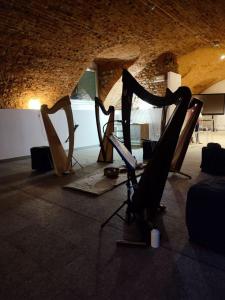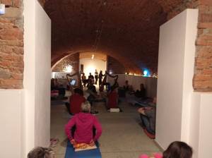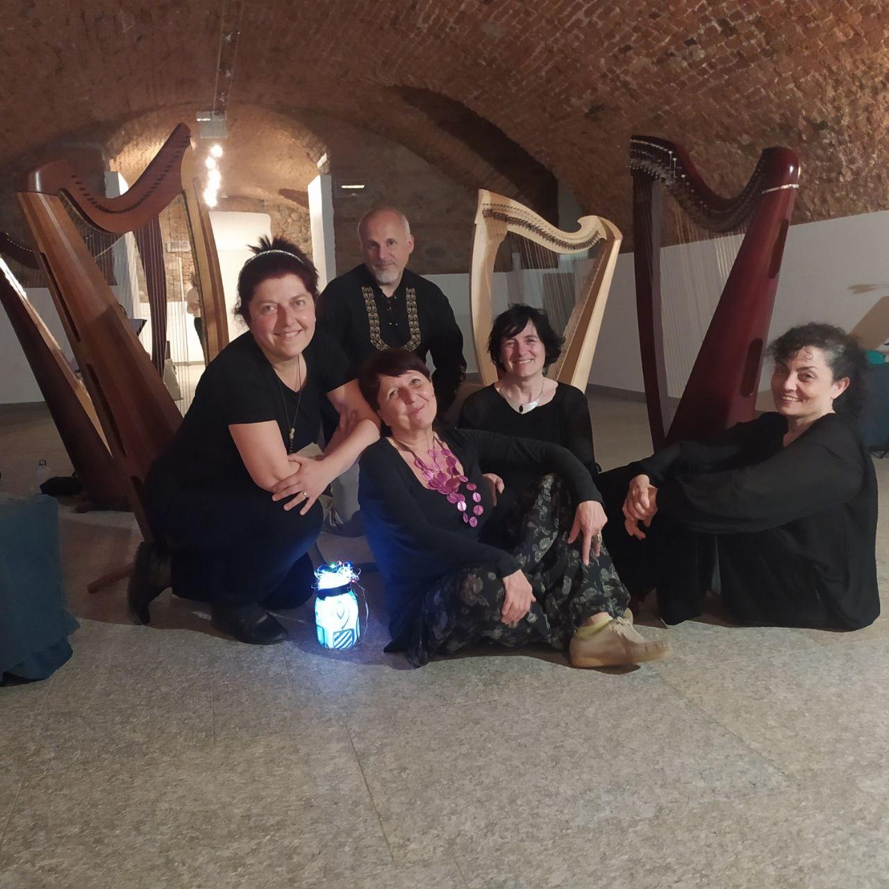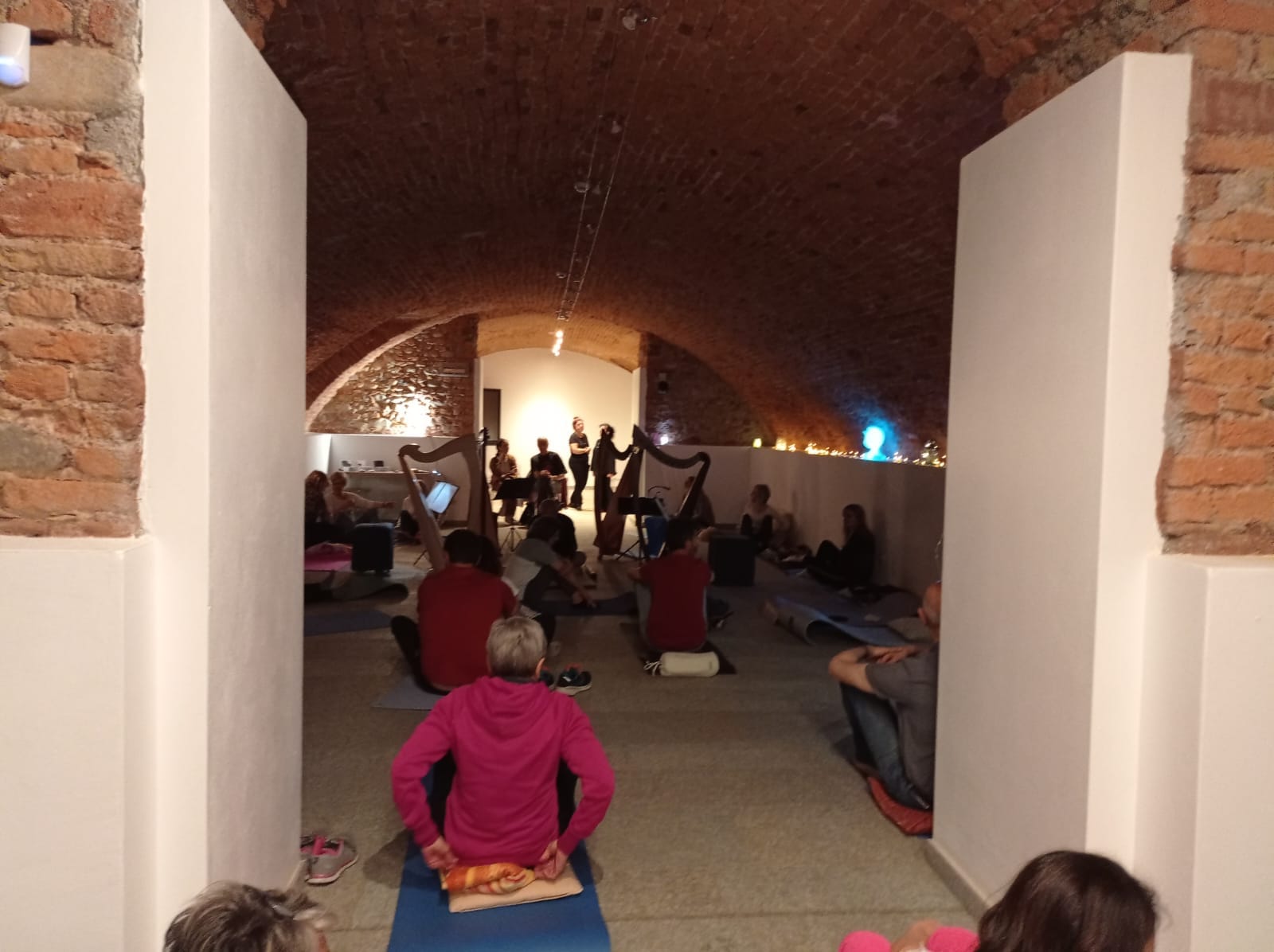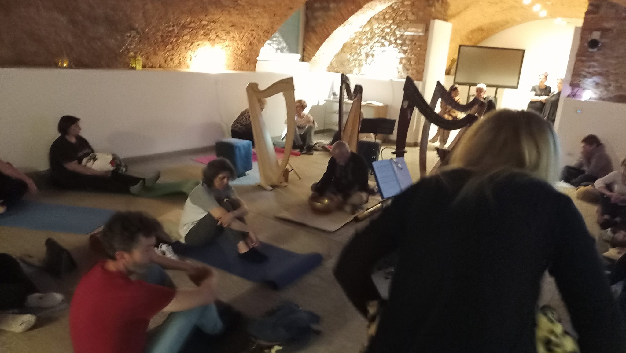 In pochissimo tempo i due saloni dedicati all’ascolto si sono riempiti di persone che si sono distribuite attorno a noi accanto alle arpe, preparando tappetini, cuscini qualche coperta di pile…